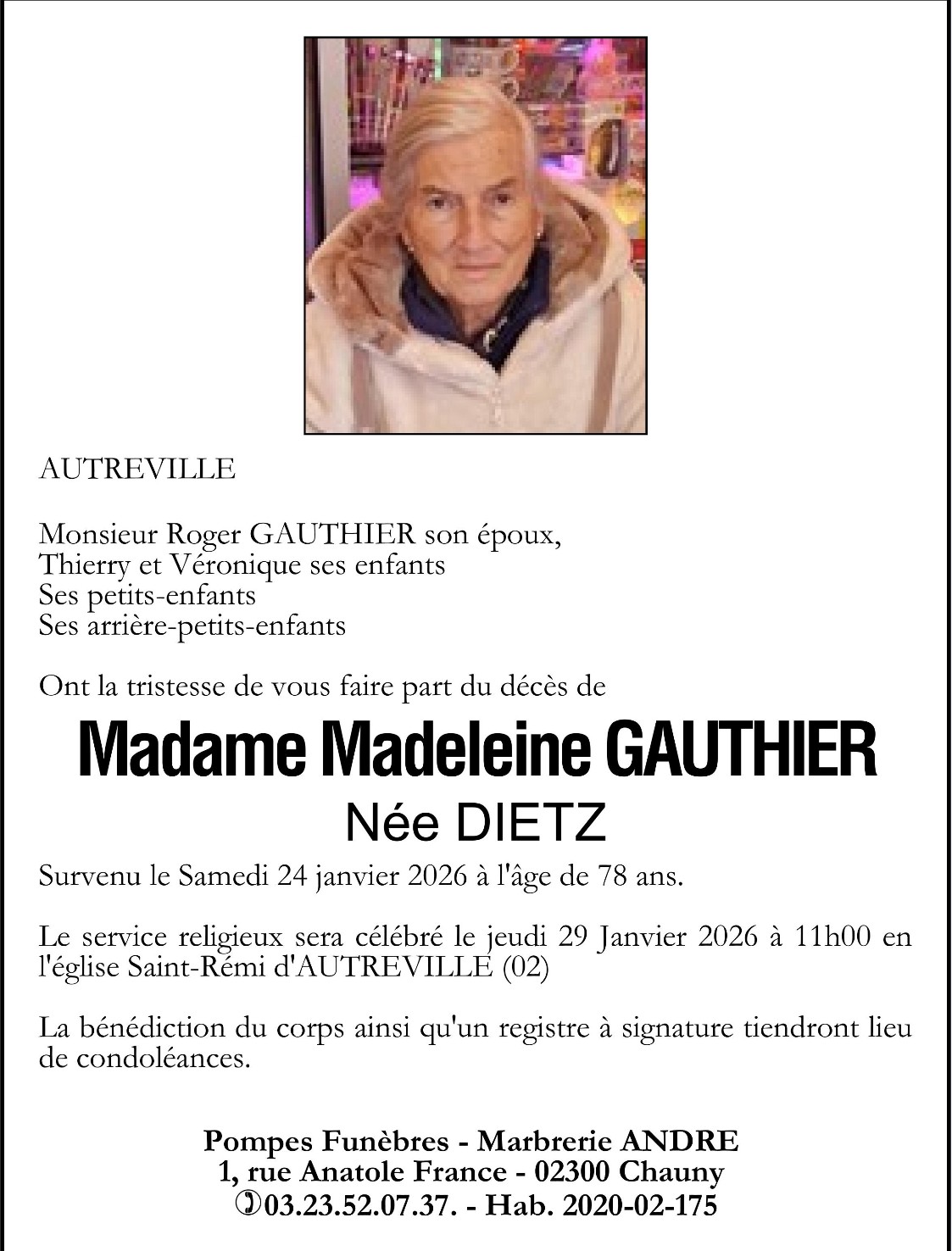 C’est avec une grande tristesse que nous vous annonçons le décès de Madeleine GAUTHIER survenu le samedi 24 janvier 2026 à Bezannes.